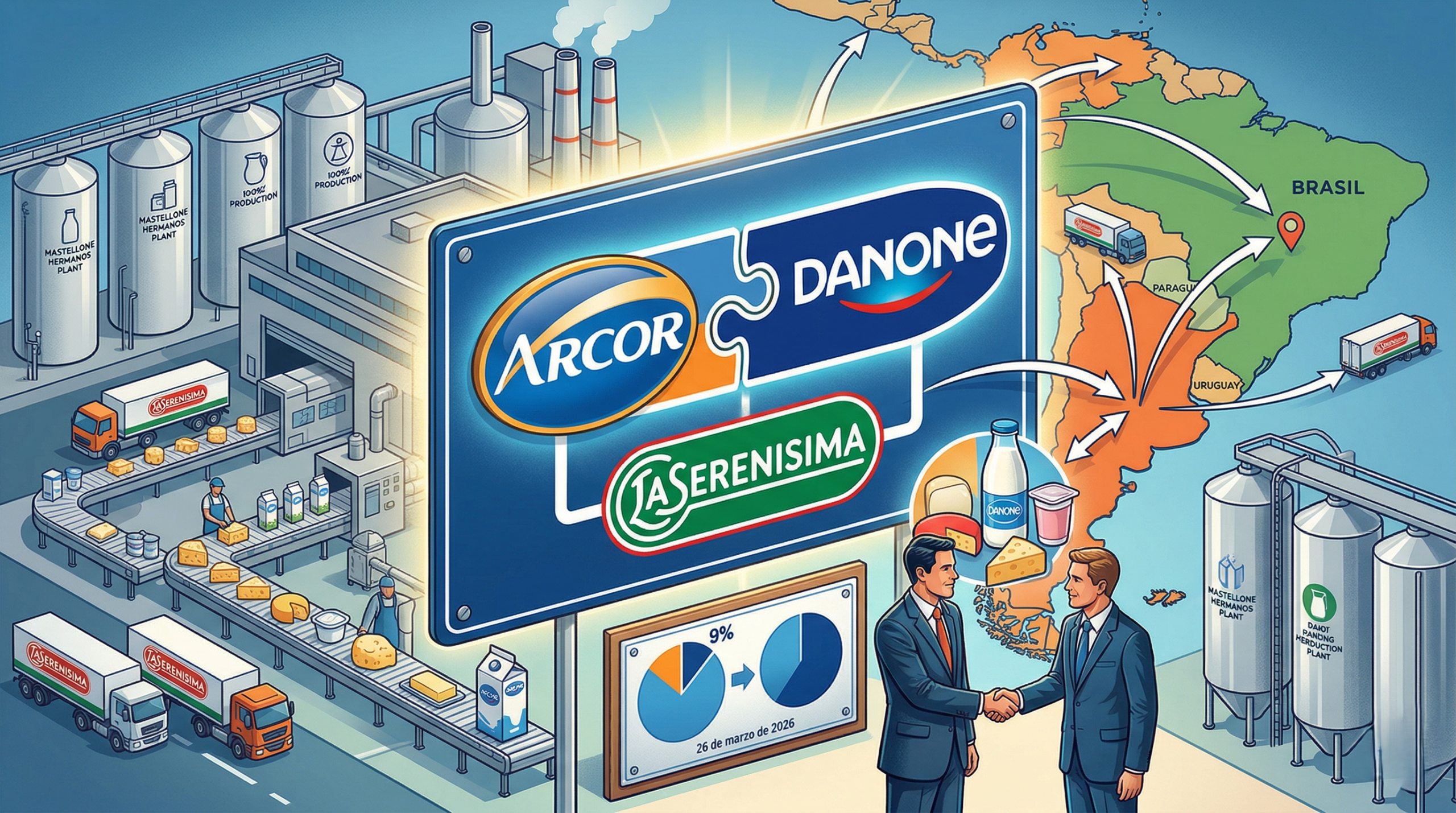 Arcor y Danone adquirieron el 51,32% restante de Mastellone Hermanos, controladora de La Serenísima, el 26 de marzo de 2026 en Argentina, completando el 100% del capital. La operación redefine el negocio lácteo por su escala, integración y proyección regional. Arcor y Danone consolidan La Serenísima Arcor y Danone avanzaron en la compra del 51,32% de Mastellone Hermanos, alcanzando el control total de La Serenísima.…