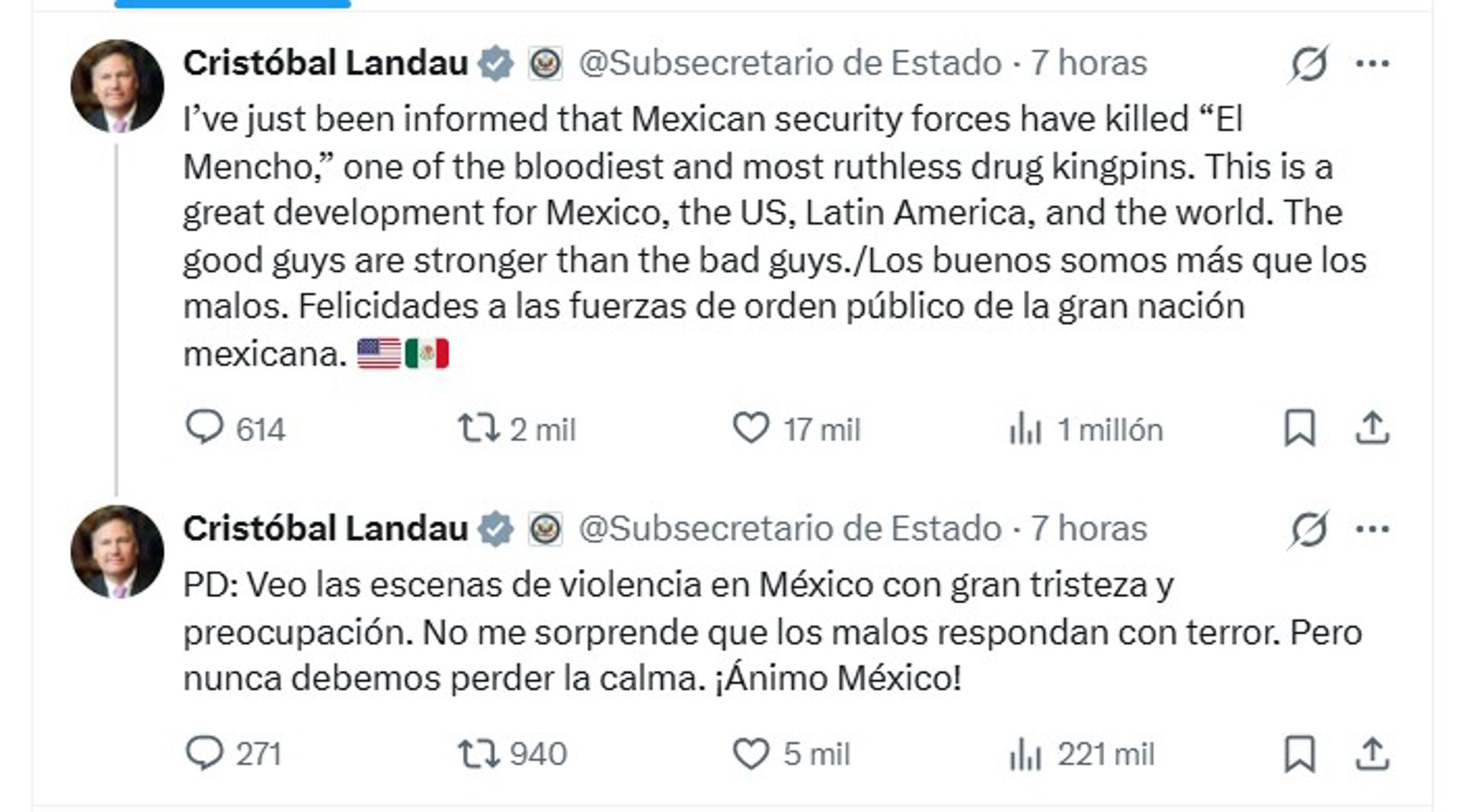 (EFE).- El subsecretario de Estado de EE.UU., Christopher Landau, felicitó este domingo a las autoridades mexicanas por el operativo que abatió a Nemesio Oseguera Cervantes, alias El Mencho, líder del Cartel Jalisco Nueva Generación (CJNG), y señaló que es un progreso en la lucha contra el narcotráfico en la región. “Este es un gran avance para México, Estados Unidos, Latinoamérica y el mundo. Los buenos…