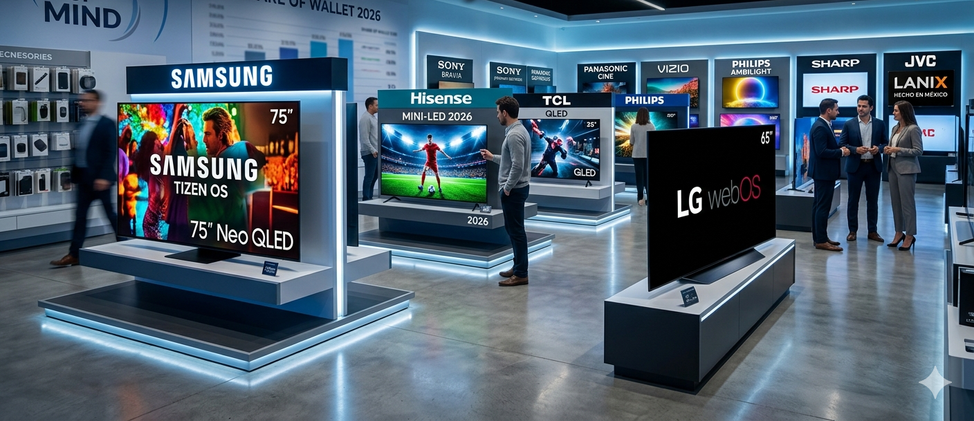 ¿Quién domina el Share of Wallet en los hogares mexicanos? En 2026, la batalla por la sala de estar se define entre la ubicuidad de Samsung, la integración vertical de LG y el crecimiento disruptivo de Hisense y TCL. El televisor como centro del ecosistema doméstico En el panorama macroeconómico actual, el sector de la electrónica de consumo representa el 3.5% del gasto trimestral de…